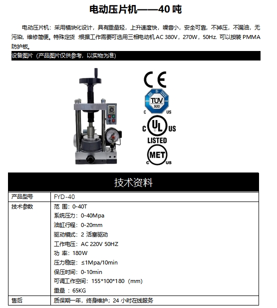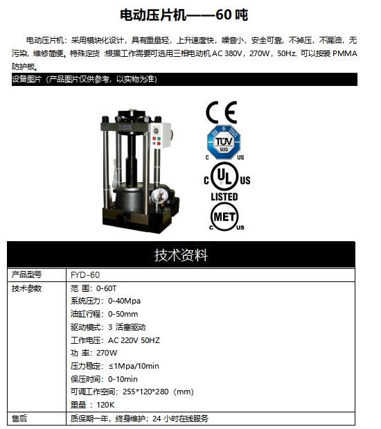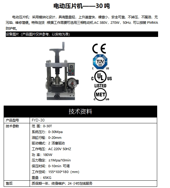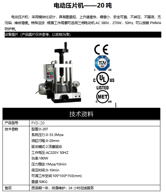 電動(dòng)壓片機(jī):采用模塊化設(shè)計(jì),具有重量輕,上升速度快,噪音小,安全可靠,不掉壓,不漏油,無(wú)污染,維修簡(jiǎn)便。特殊定貨 :根據(jù)工作需要可選用三相電動(dòng)機(jī)AC 380V,270W,50Hz. 可以按裝PMMA防護(hù)板。